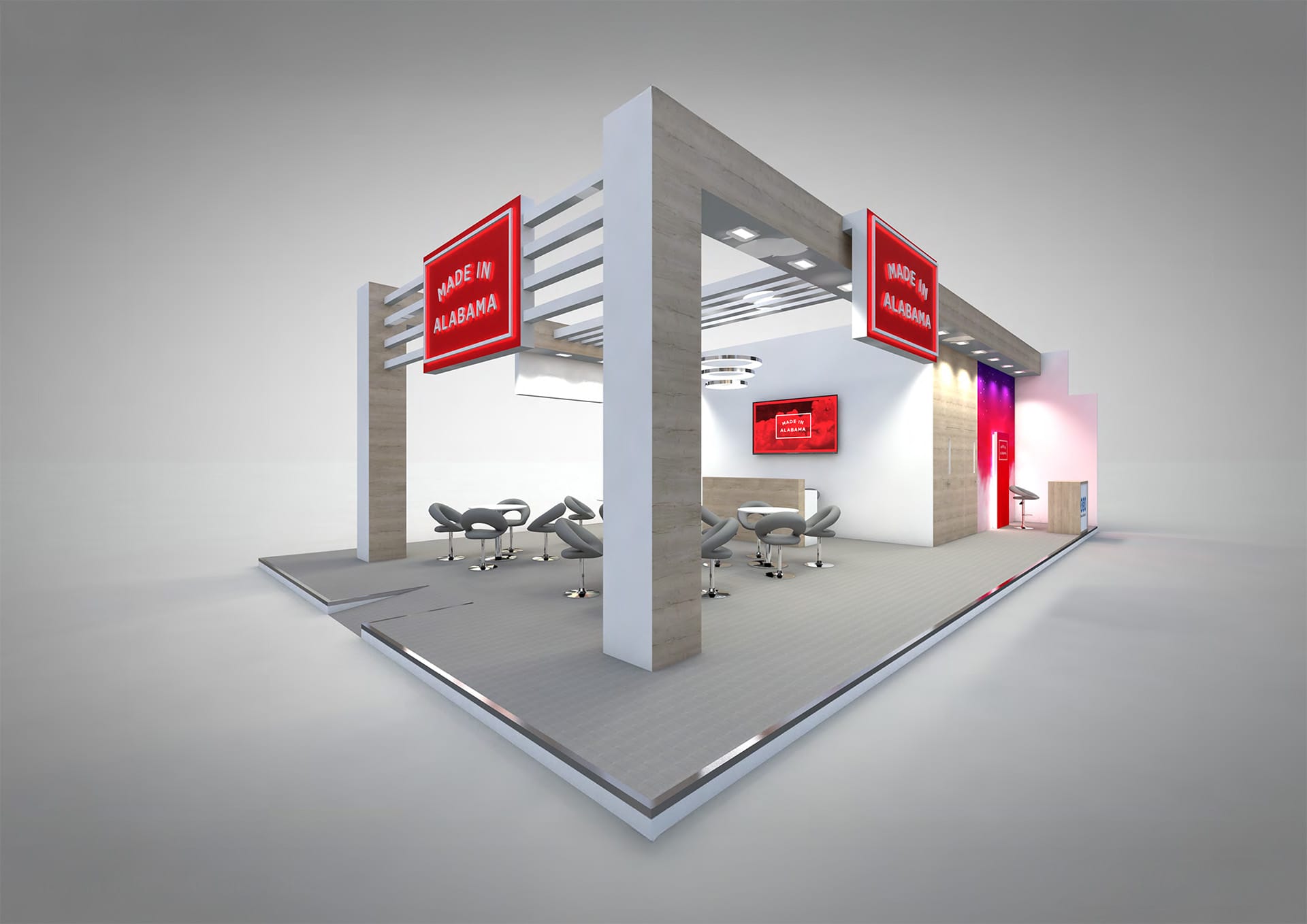 The stand featured enclosed meeting rooms to facilitate private discussions, complemented by a dedicated store area for efficient organisation. A striking feature fascia canopy created a strong architectural presence and helped define the stand’s structure.