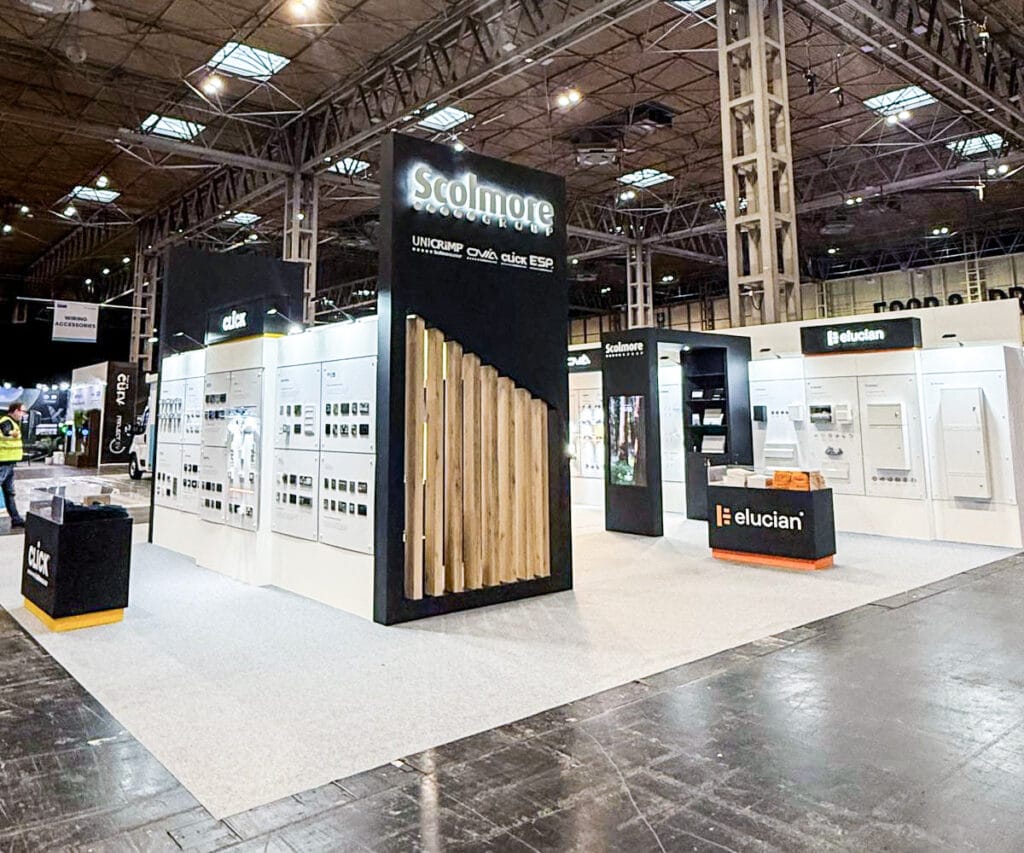 Scolmore exhibited at Rexel REXelerate 2026, held from the 10th to the 11th of February at the NEC in Birmingham, with a 10m x 10m stand designed to create strong brand presence and clear product visibility. A striking feature wall and canopy defined the space, while a welcoming reception desk provided a natural focal point