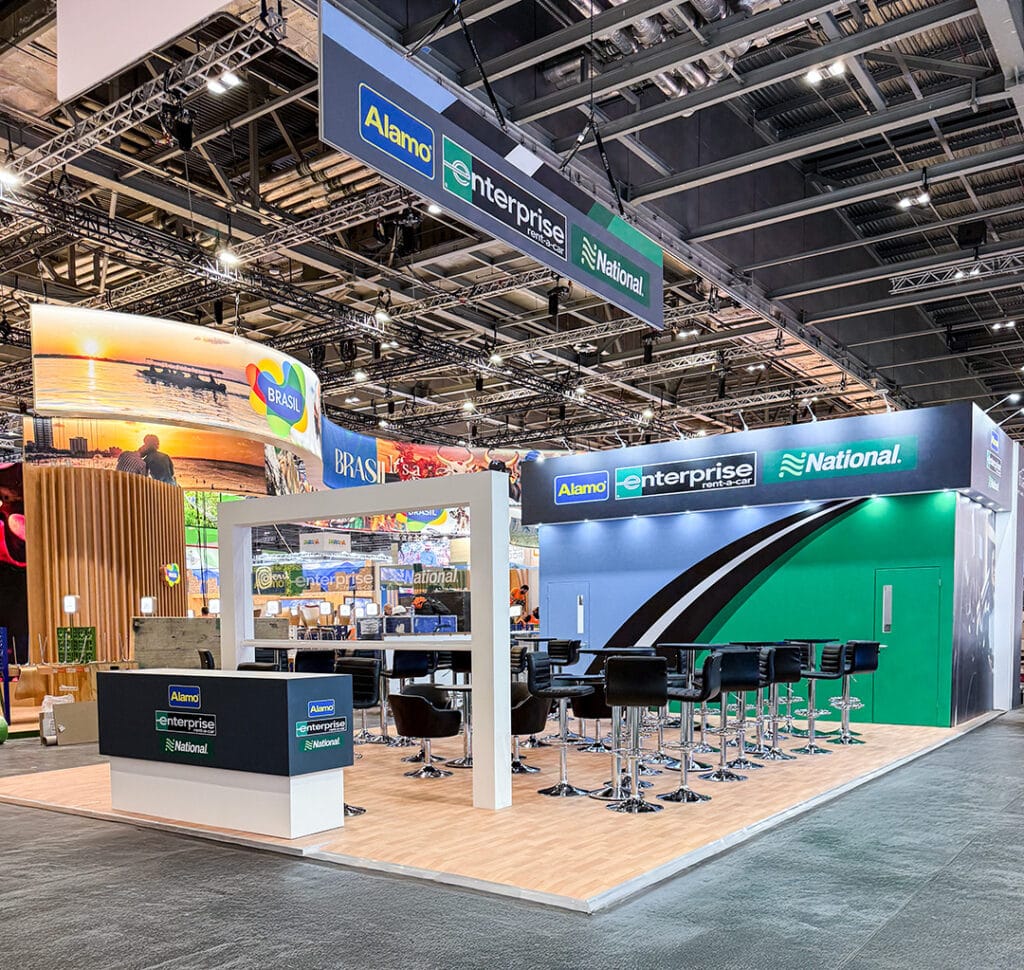 Enterprise Rent-A-Car showcased a contemporary and engaging 12m x 6.5m stand at World Travel Market 2025, designed to reflect the brand’s professional image and global reach. The stand featured a fully equipped meeting room and storeroom, providing both functionality and privacy for business discussions. Built on a ramped access platform with a PVC floor lino