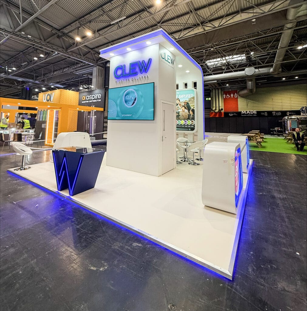 Clew exhibited at Vaper Expo 2025, held from the 9th to the 10th of May at the NEC in Birmingham. Positioned on a 6m x 6m island stand, the space was designed for maximum exposure and accessibility from all directions. The stand featured a sleek edged-lit platform finished with high-quality vinyl flooring, providing a modern