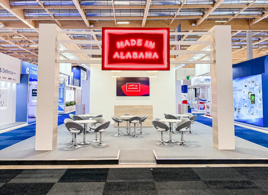 Alabama exhibited at the International Paris Air Show 2025, held from the 16th to the 22nd of June. Their expansive 13.5m x 8m stand was designed to make a bold, professional impression while offering a highly functional environment for business engagement. The stand featured enclosed meeting rooms to facilitate private discussions, complemented by a dedicated