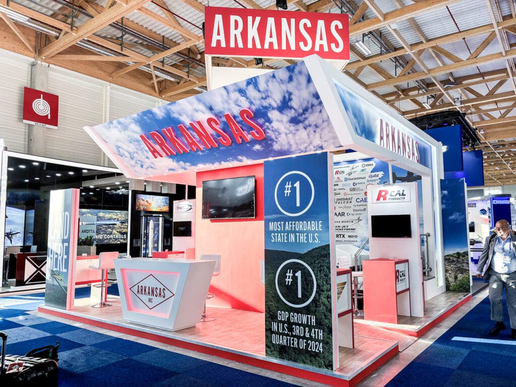 Arkansas exhibited at the International Paris Air Show 2025, held from the 16th to the 22nd of June. Their 7m x 7m stand was designed to deliver maximum visibility, accessibility, and brand impact within a refined and functional layout. A large overhead banner, supported by rigging, ensured long-range visibility across the exhibition hall, while an