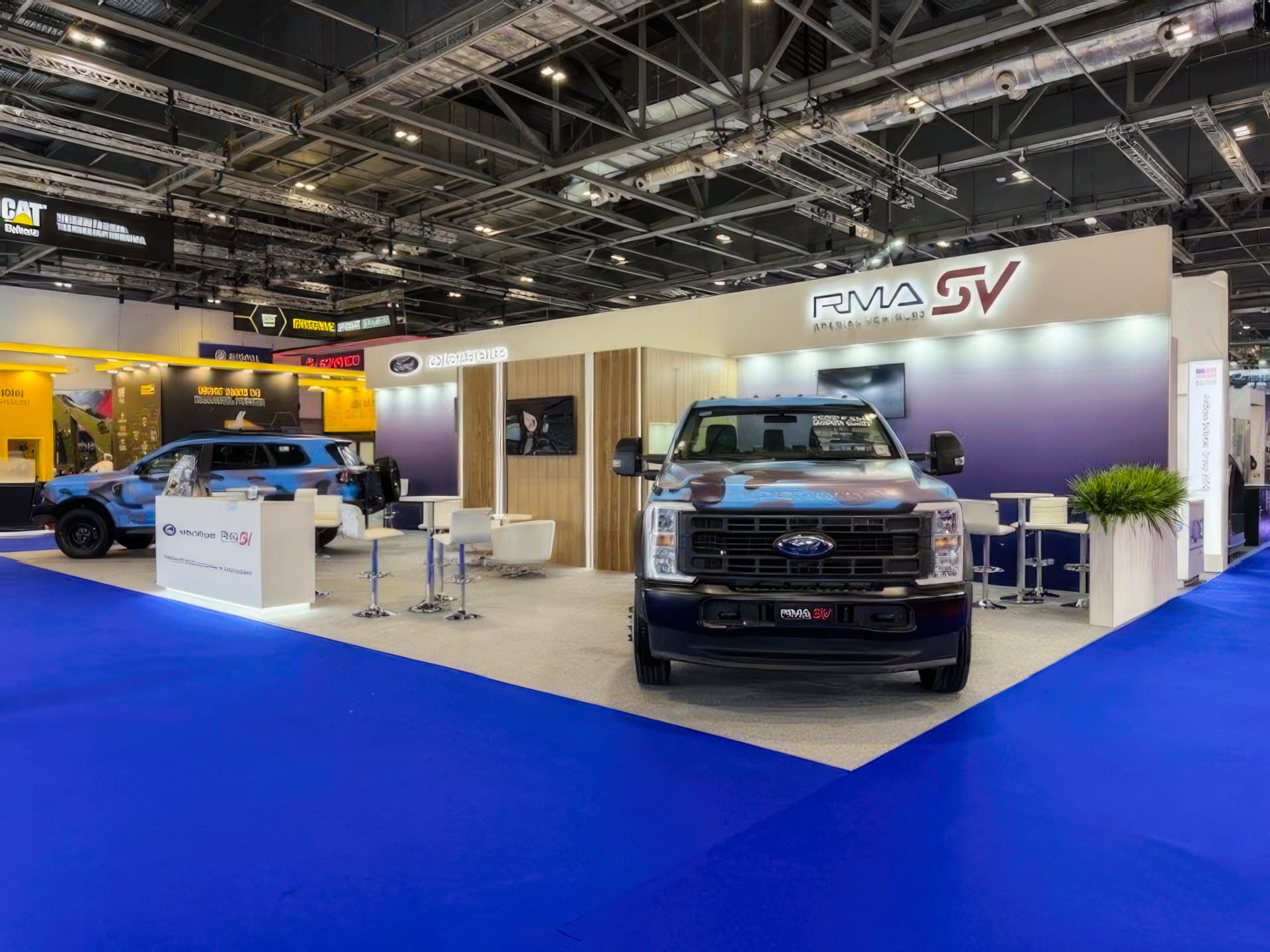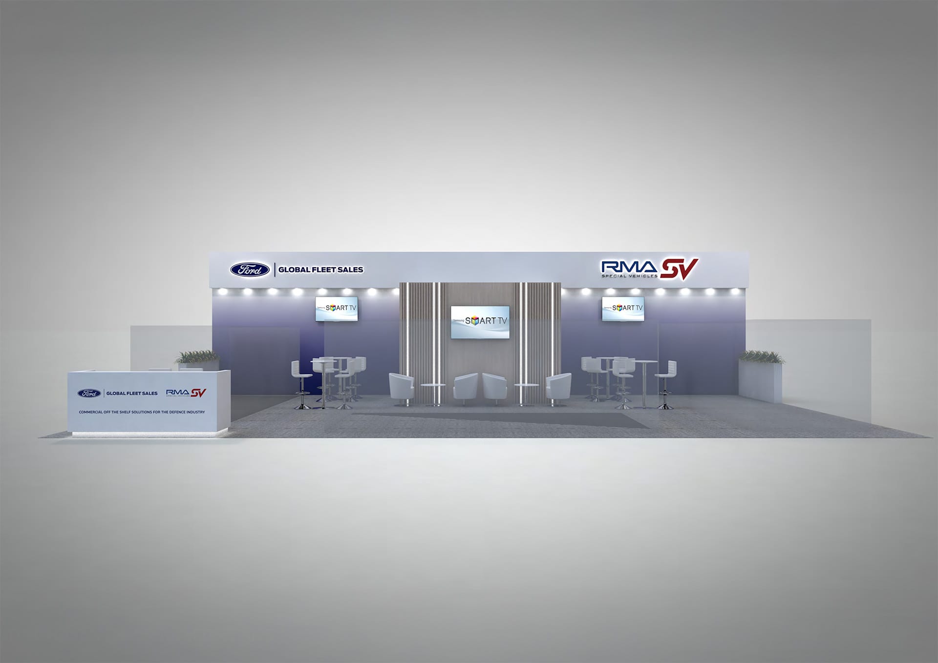 Ford Global Fleet Sales presented a spacious and professional 15m x 7m stand at DSEI UK 2025, open on three sides to maximise visitor engagement. The stand featured dedicated meeting areas alongside a combined kitchen and storeroom, supporting both hospitality and operational needs.