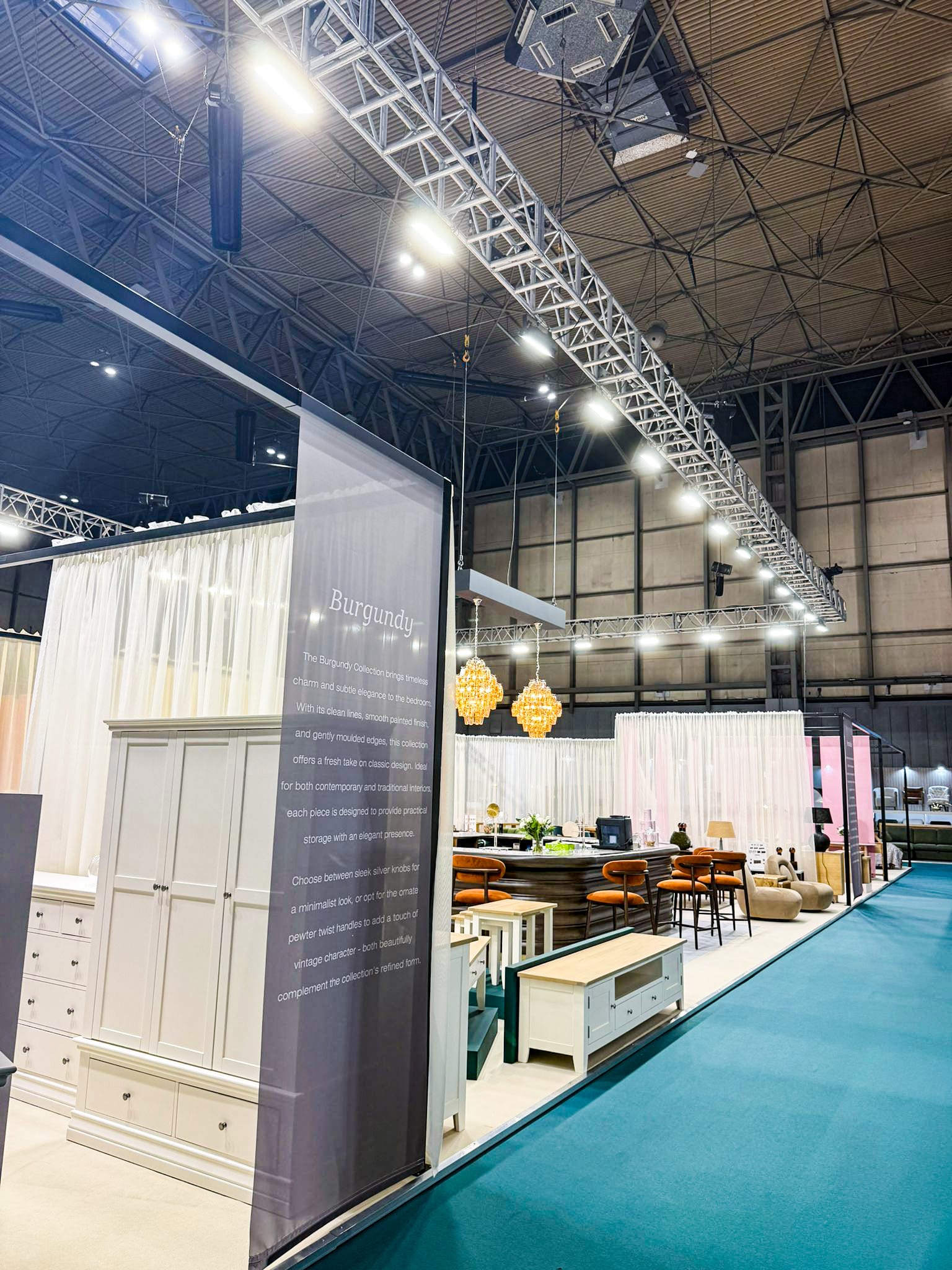 Bold graphics reinforced brand identity throughout the space, while integrated electrics and carefully planned lighting enhanced both functionality and presentation. Together, these elements created a visually striking and welcoming environment that effectively showcased Global Home’s collections throughout the show.
