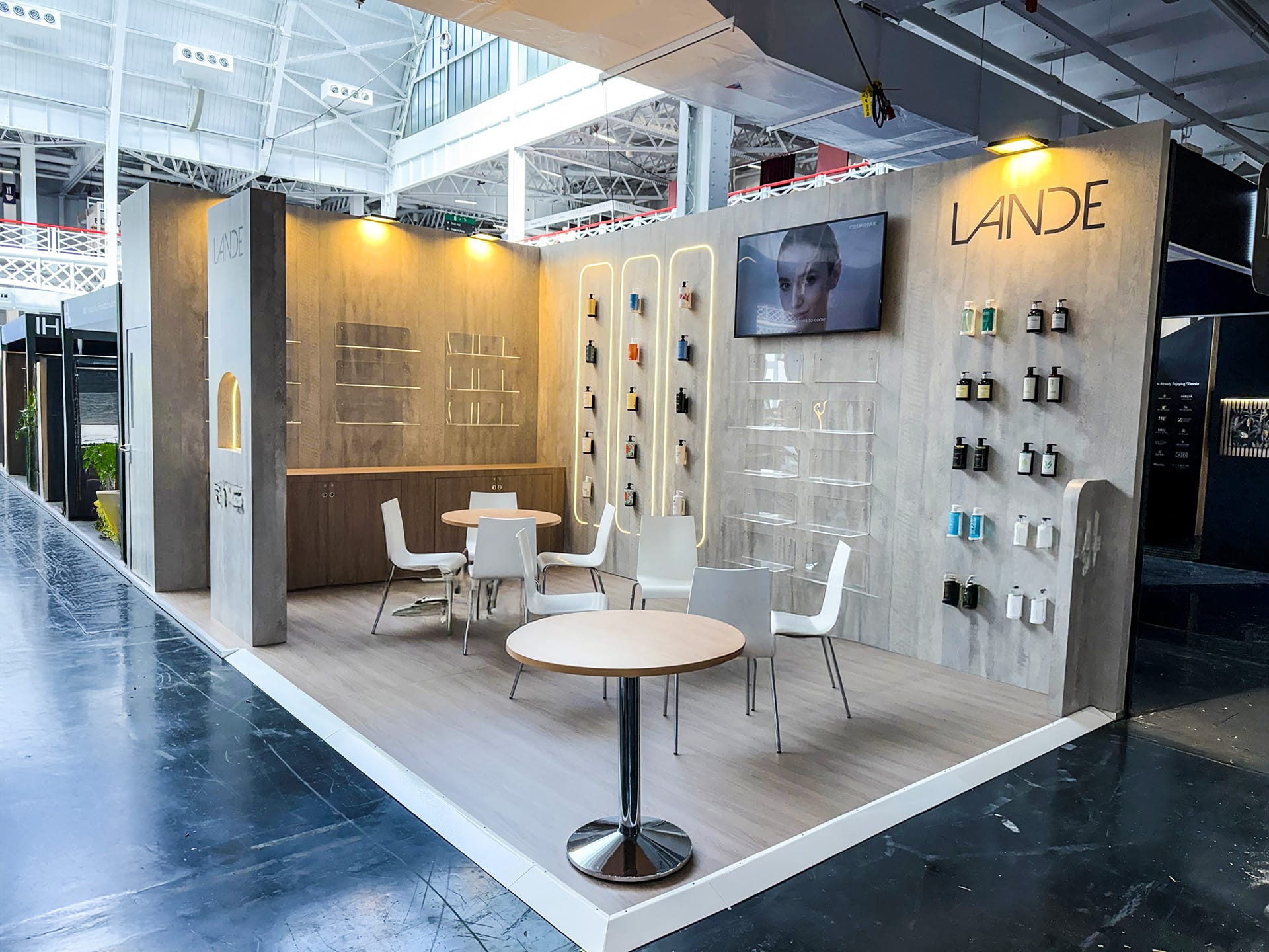 Plexiglass shelves and low lockable cabinets showcased key products elegantly, complemented by warm LED lighting and premium furniture to enhance visitor comfort. Supported by full graphics, electrics, AV, and lighting, the stand achieved a polished and modern aesthetic that effectively communicated LANDE’s brand values.