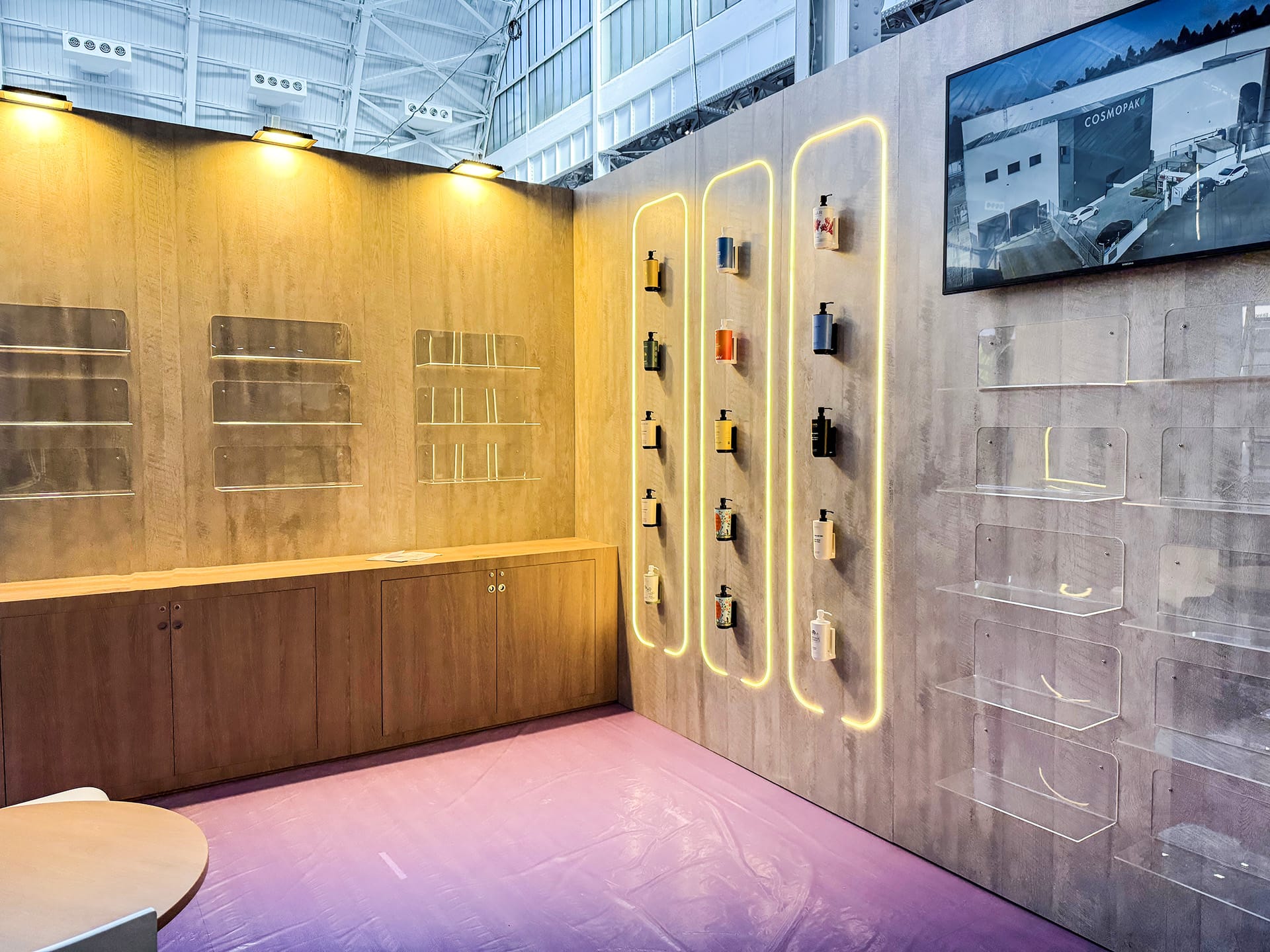The stand featured a laminated concrete wall and a feature wall with integrated LED lighting, creating a warm and inviting atmosphere. A practical storeroom provided functionality, while a laminated wood floor and aluminium ramp offered both accessibility and refinement.