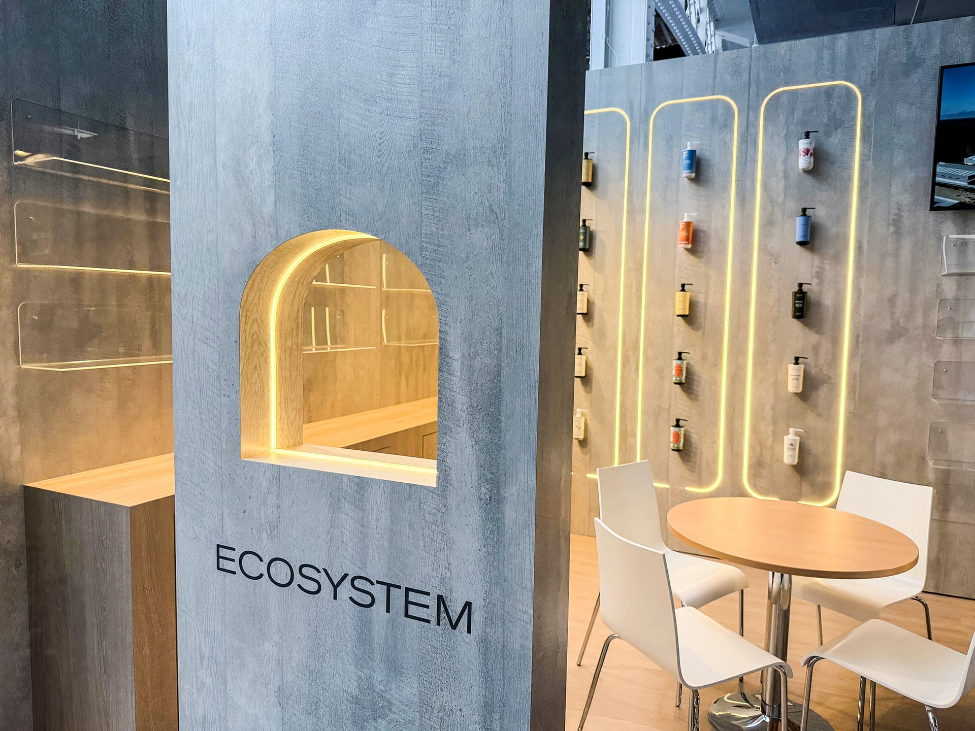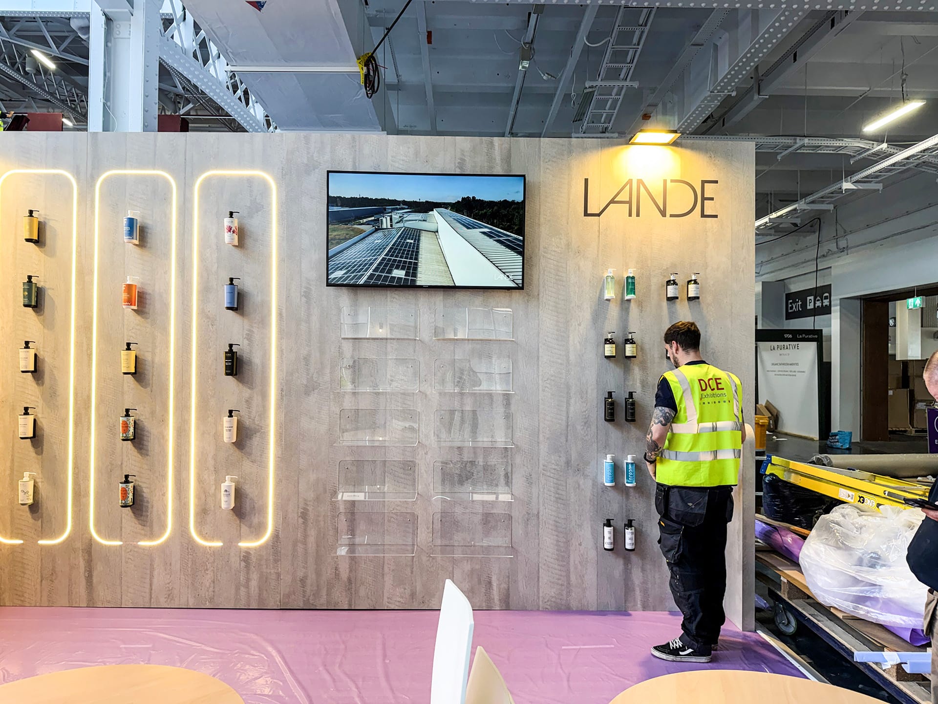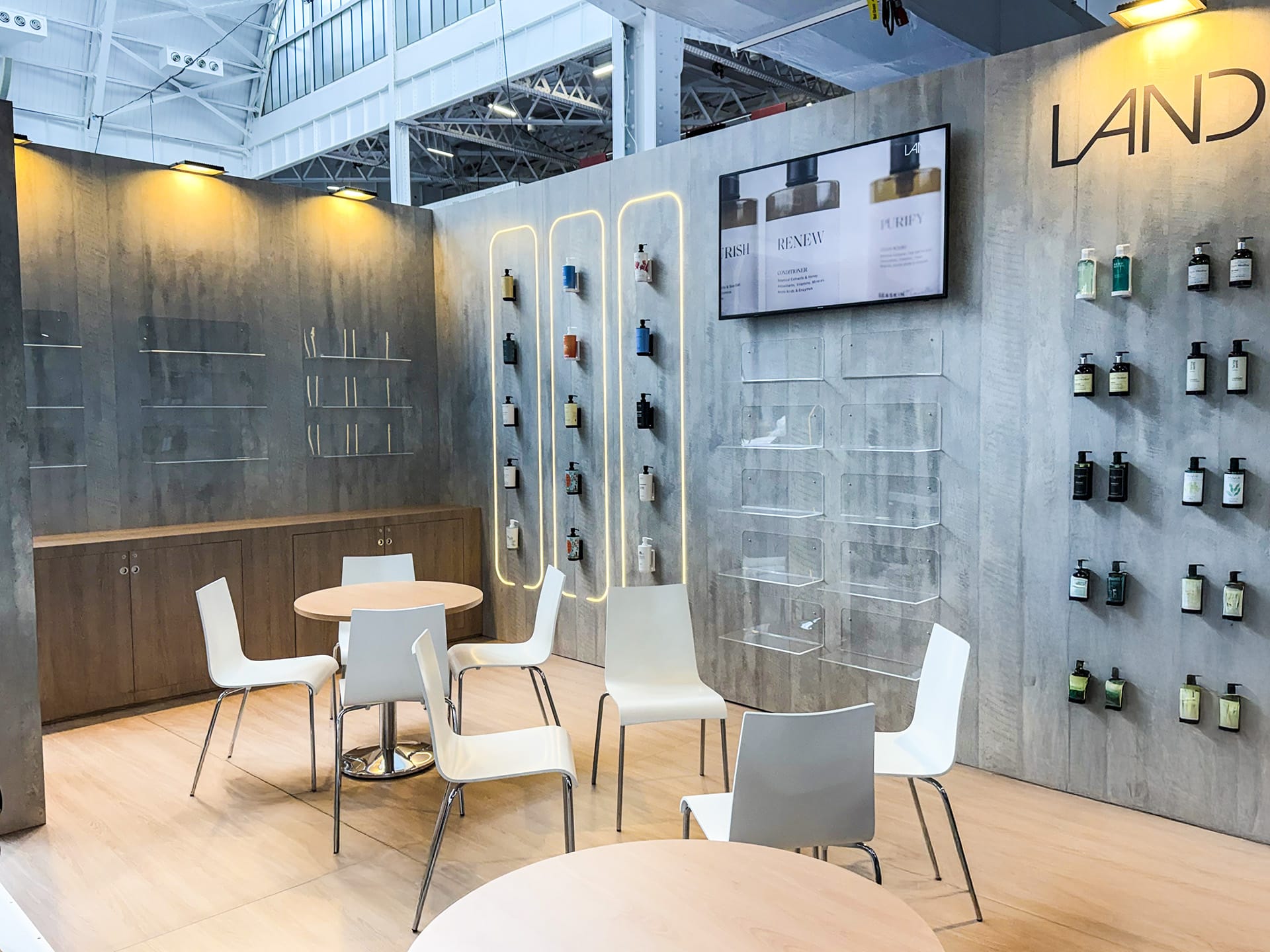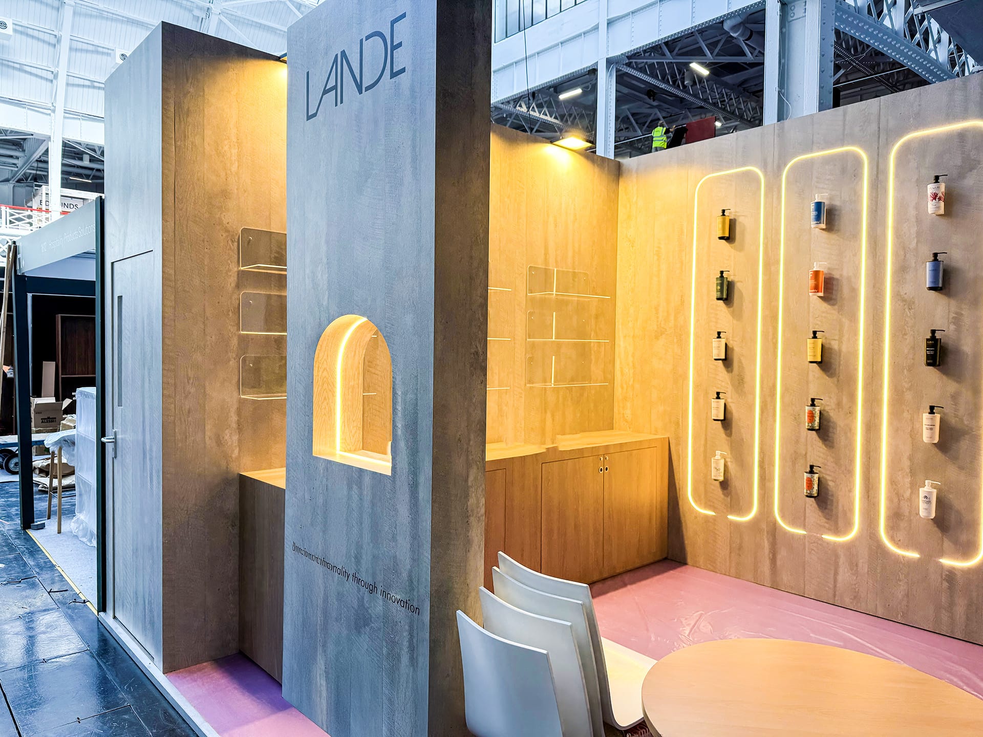 Plexiglass shelves and low lockable cabinets showcased key products elegantly, complemented by warm LED lighting and premium furniture to enhance visitor comfort. Supported by full graphics, electrics, AV, and lighting, the stand achieved a polished and modern aesthetic that effectively communicated LANDE’s brand values.