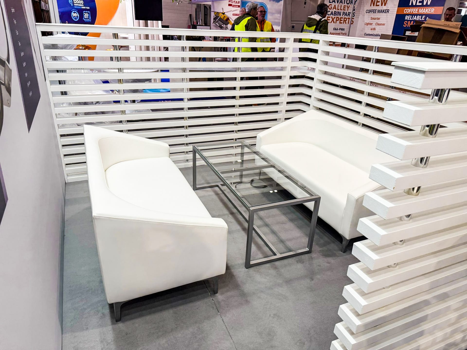 A prominent overhead hanging banner ensured high visibility across the exhibition hall, while a meeting room and storeroom provided practical and private spaces for discussions and event operations. Privacy dwarf walling helped define zones within the open layout, creating structure while maintaining accessibility.