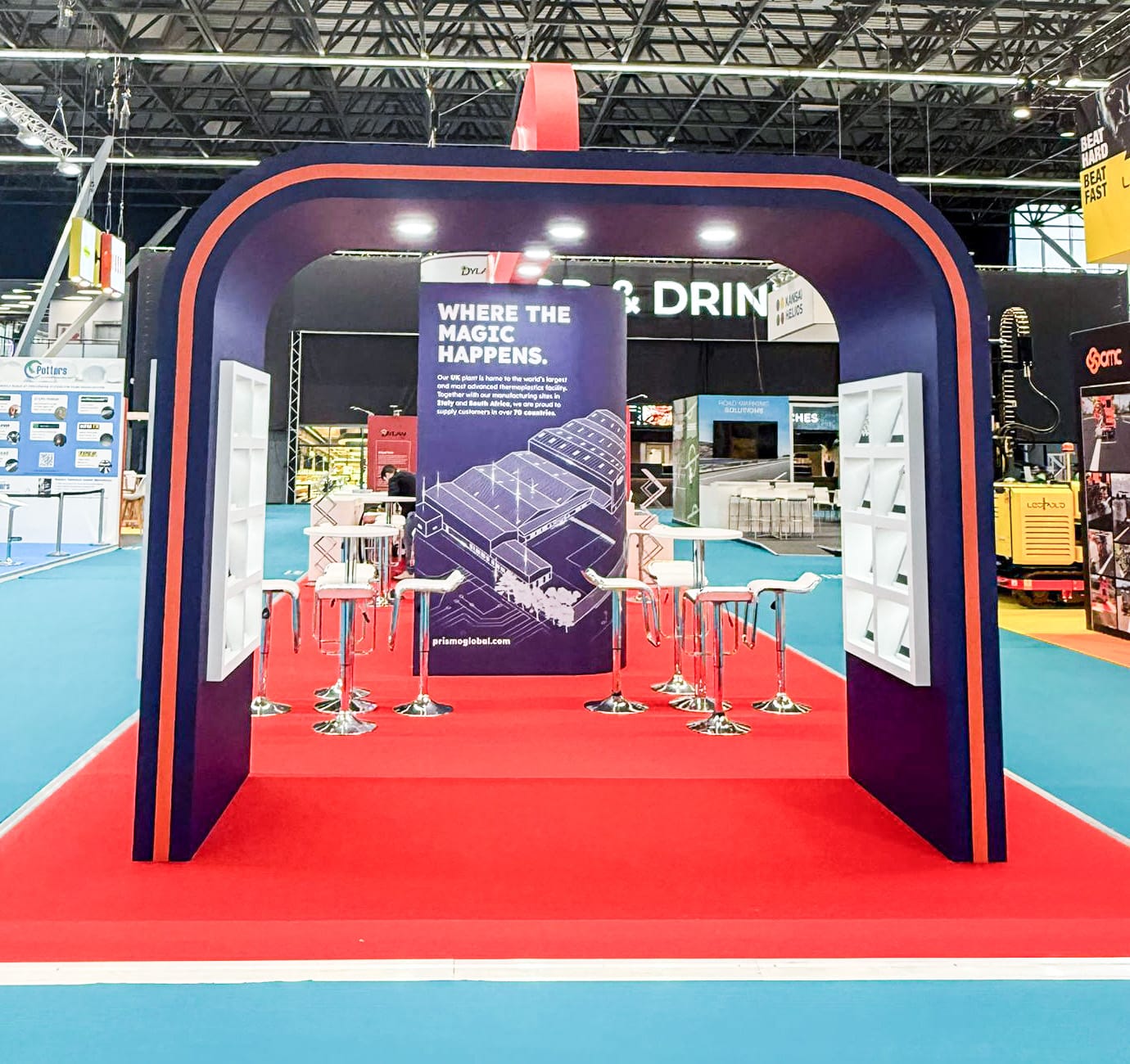 The stand featured a central storeroom to support day-to-day operations, while an overhead canopy with integrated shelving formed a distinctive architectural feature above the space. Branding was enhanced through self-adhesive graphics, back-lit light boxes, and a prominent 3D LED edge-lit logo with white illumination behind it, ensuring the brand stood out across the exhibition hall.
